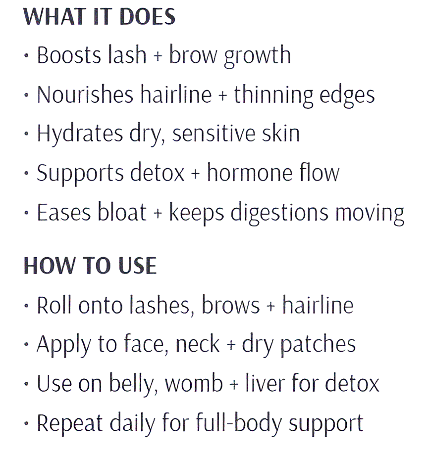 ✦ Lashes & Brows: Dab a little oil onto lashes or brows using a clean spoolie or fingertip. Castor Oil has long been used to condition and support the appearance of fuller lashes and brows.