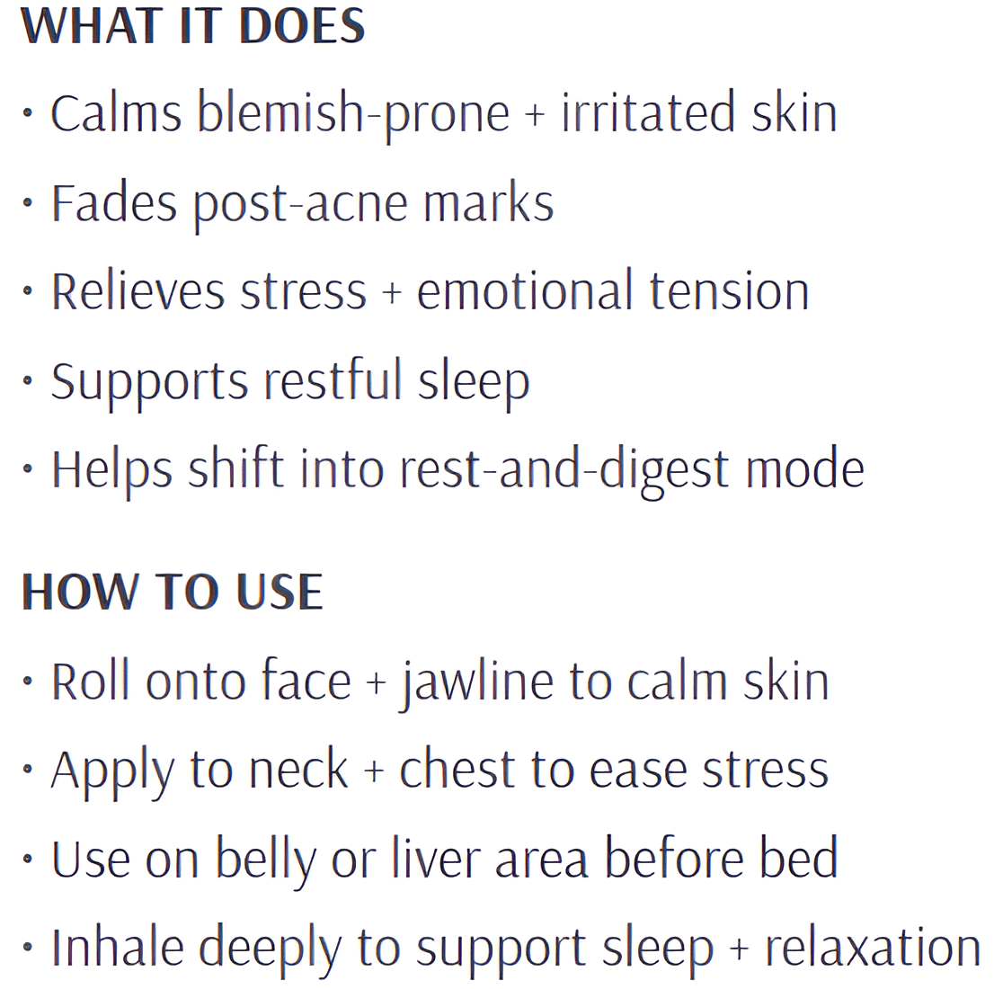 A skin-soothing essential oil, perfectly diluted in Castor Oil to calm the skin and settle the nervous system—day or night.